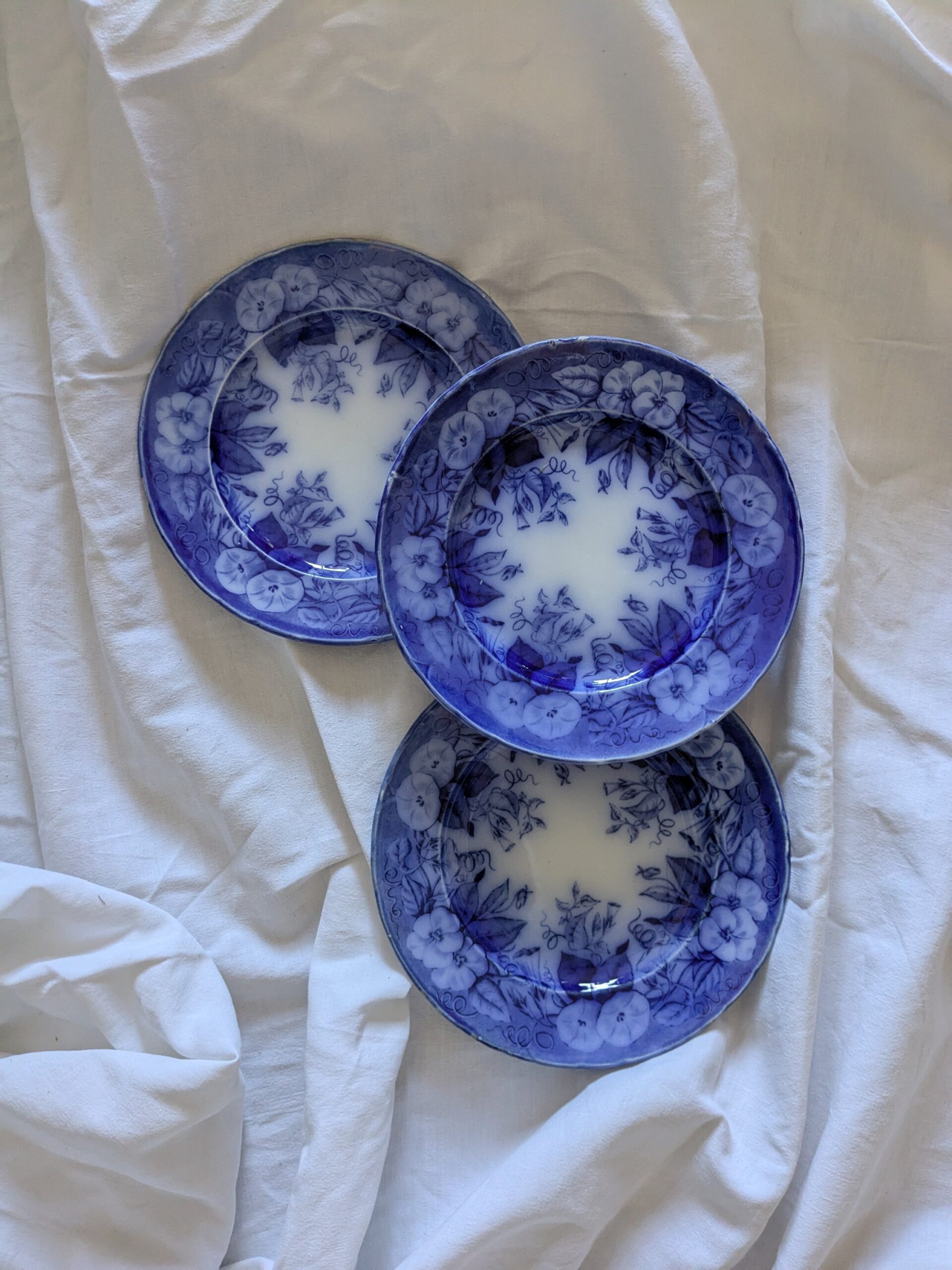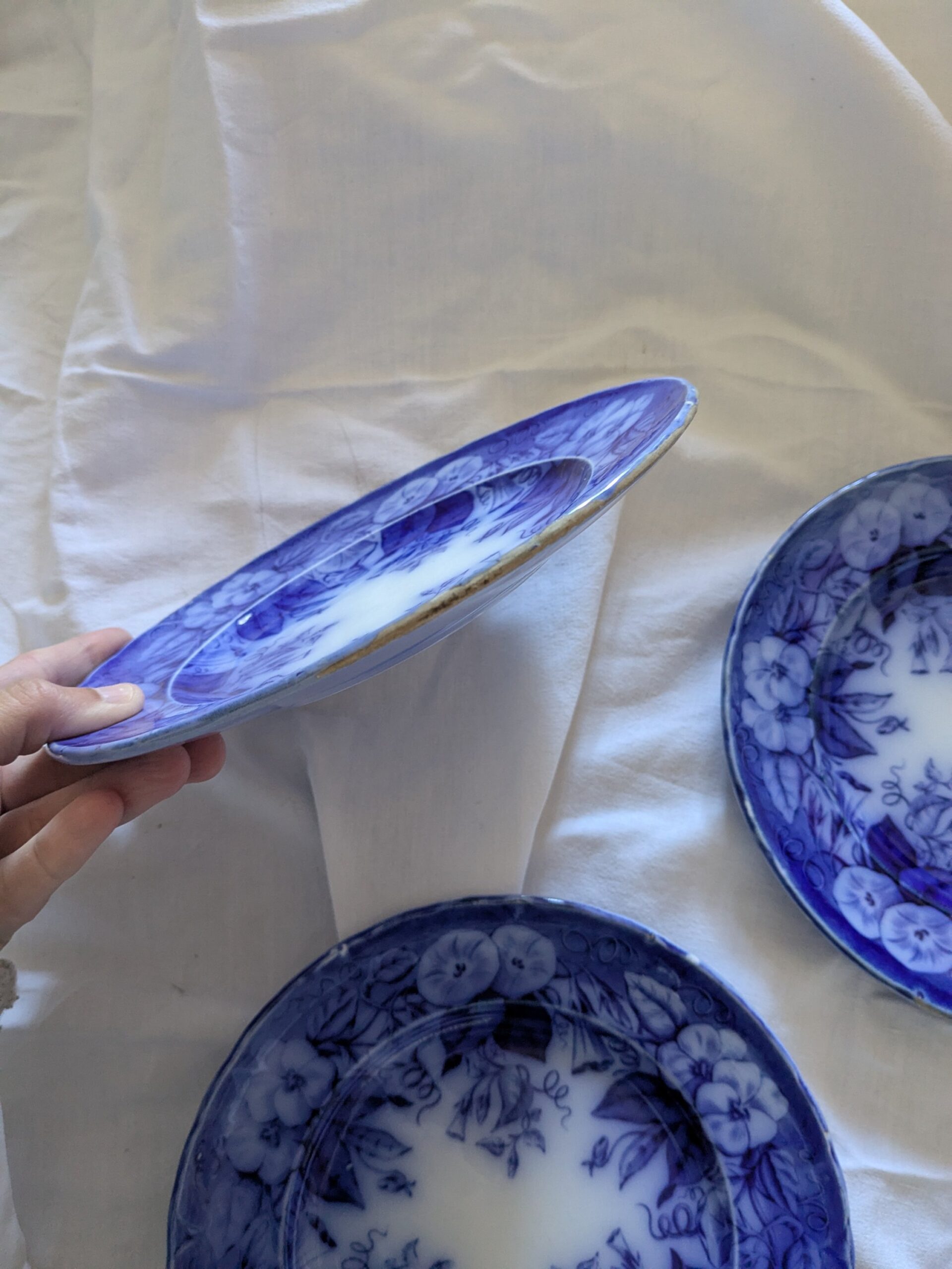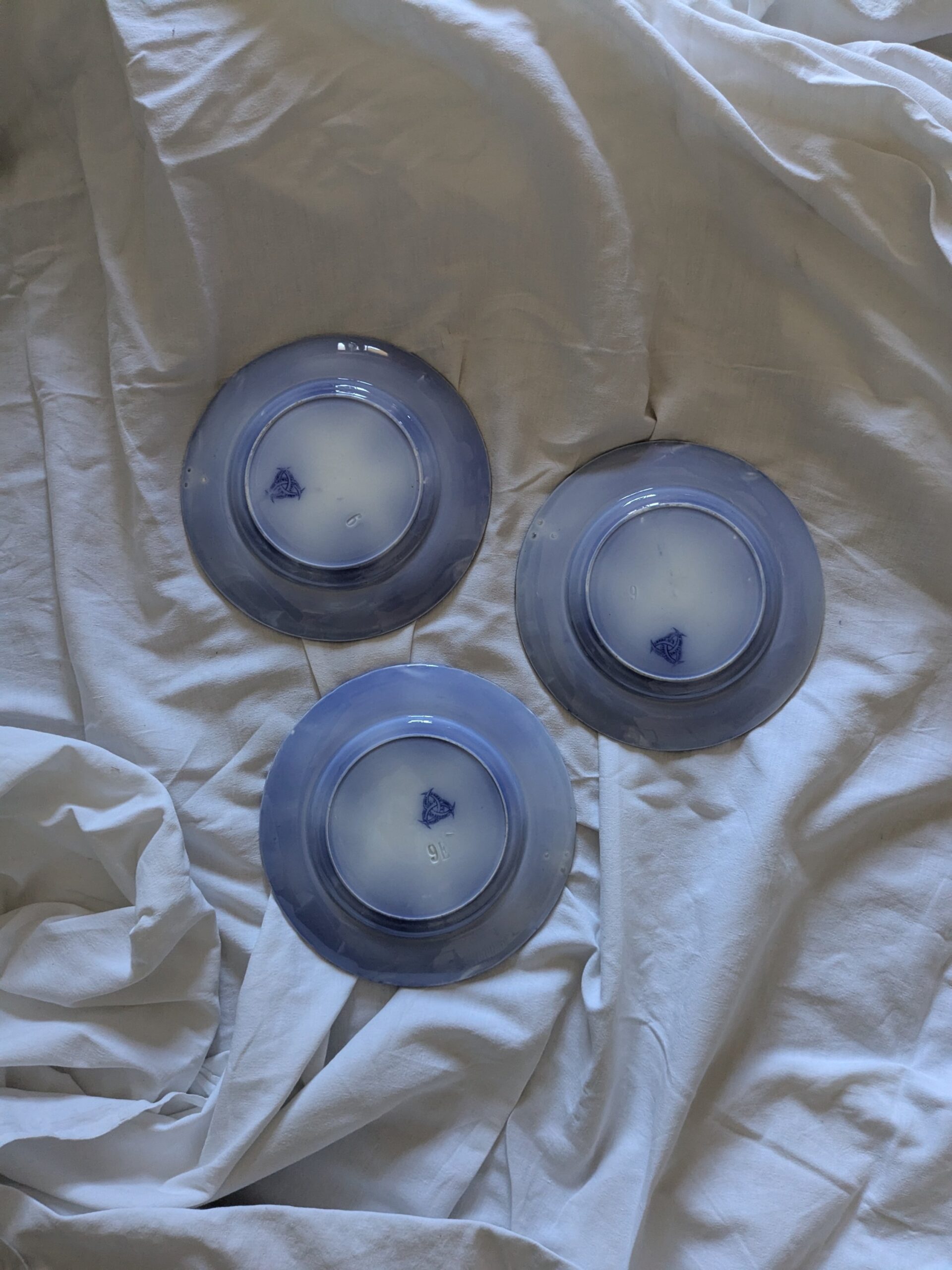 Assiettes à dessert vieillard, vendues à l’unité. Joli modèle de volubilis. Bon état, pas d’egrenures mais quelques manques d’email sur le bord.