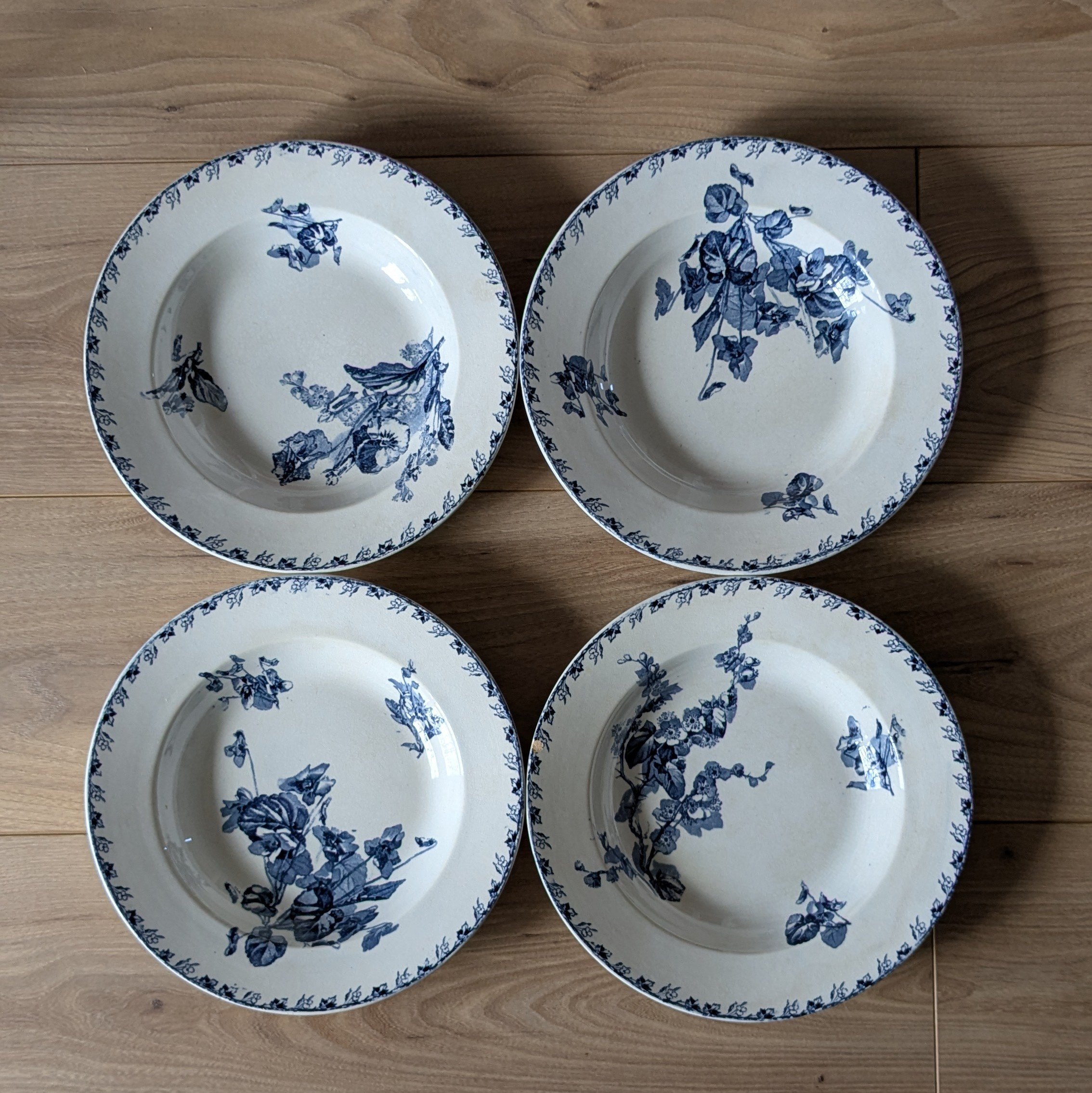 Lot de 4 assiettes creuses Sarreguemines modèle Stella. Bon état, l’une des assiettes a un petit choc.
