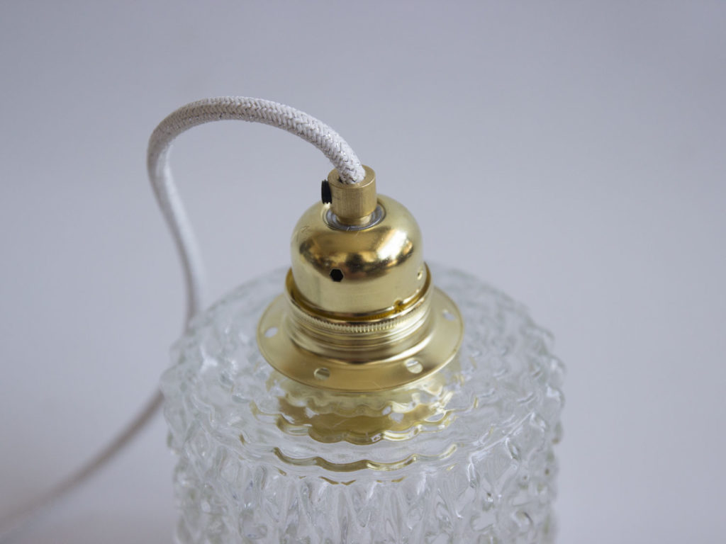Baladeuse au globe ancien en verre. L’ensemble du système électrique est neuf, le globe est ancien et a un éclat très discret sur le rebord (voir photos). Le câble en tissu blanc pailleté mesure 3m ce qui vous permettra d’utiliser la baladeuse comme bon vous semble, nouée sur une échelle ancienne, sur un porte-manteau, sur une équerre fixée au mur ou simplement posée sur un meuble.