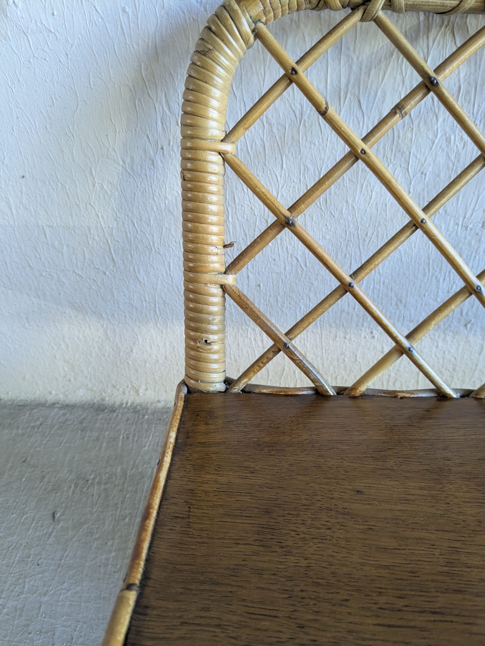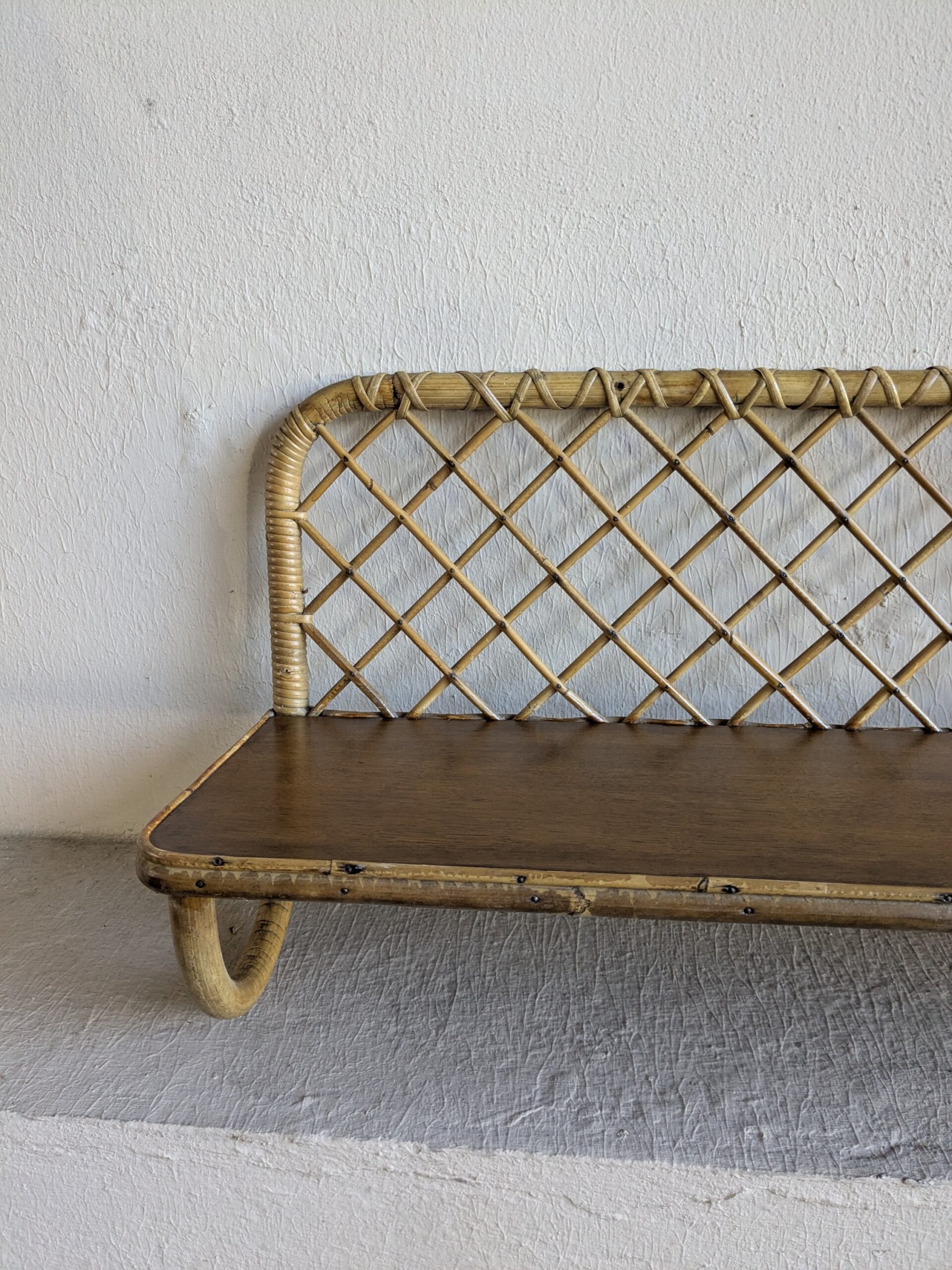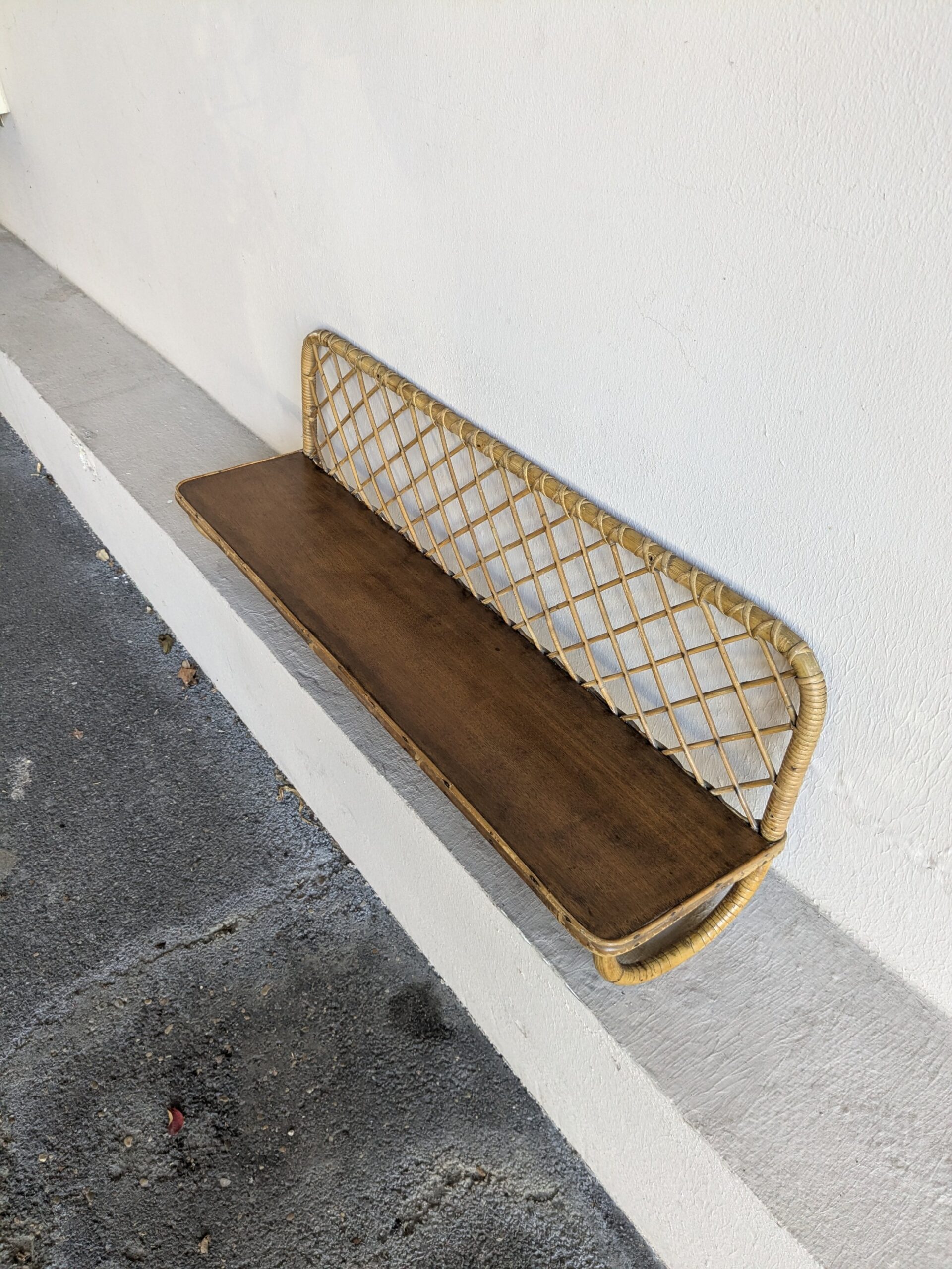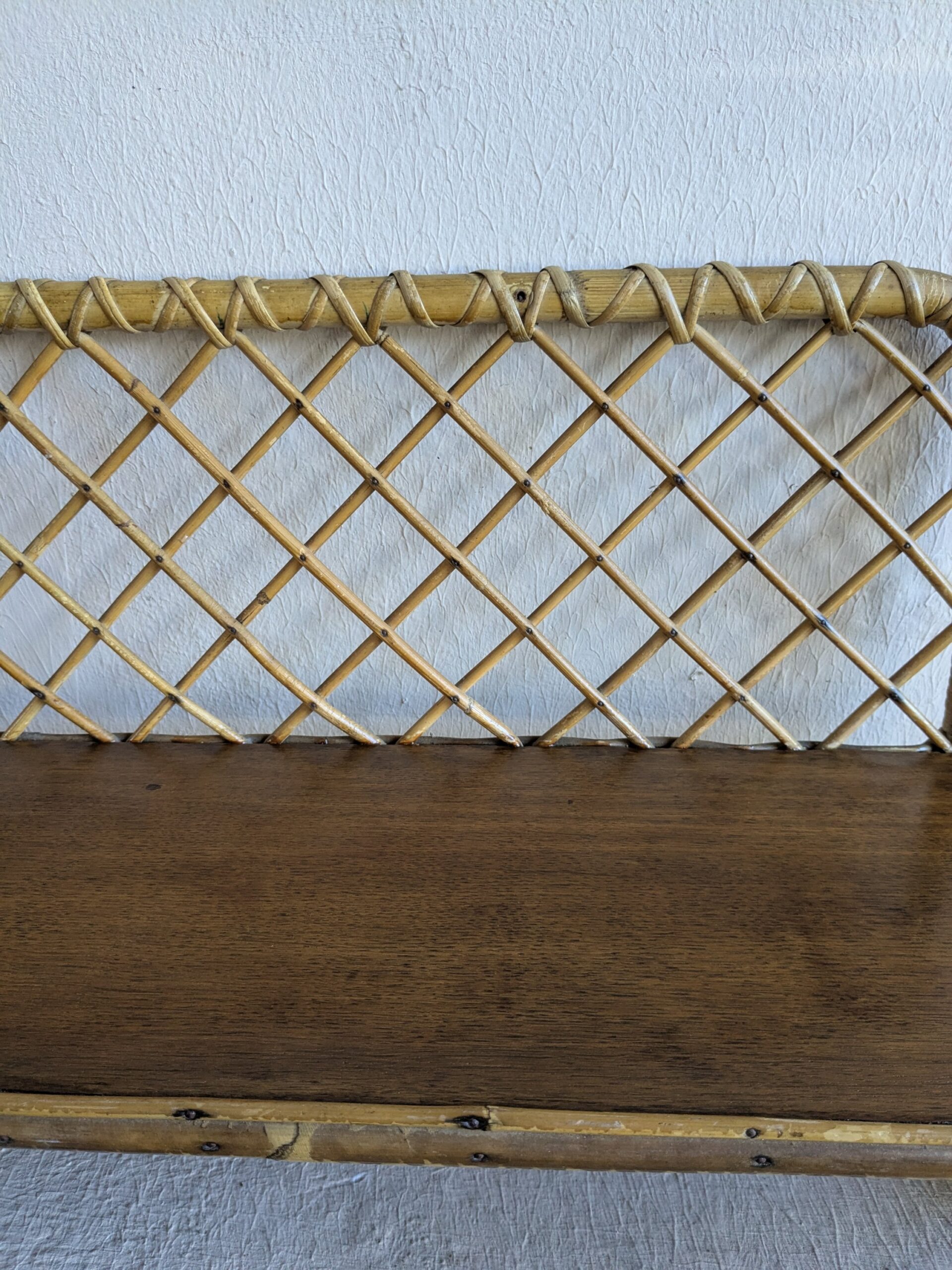 Étagère murale en rotin, le plateau est plaqué en chêne. L’ensemble est en très bon état. Elle sera à fixer avec 2 vis (non fournies).