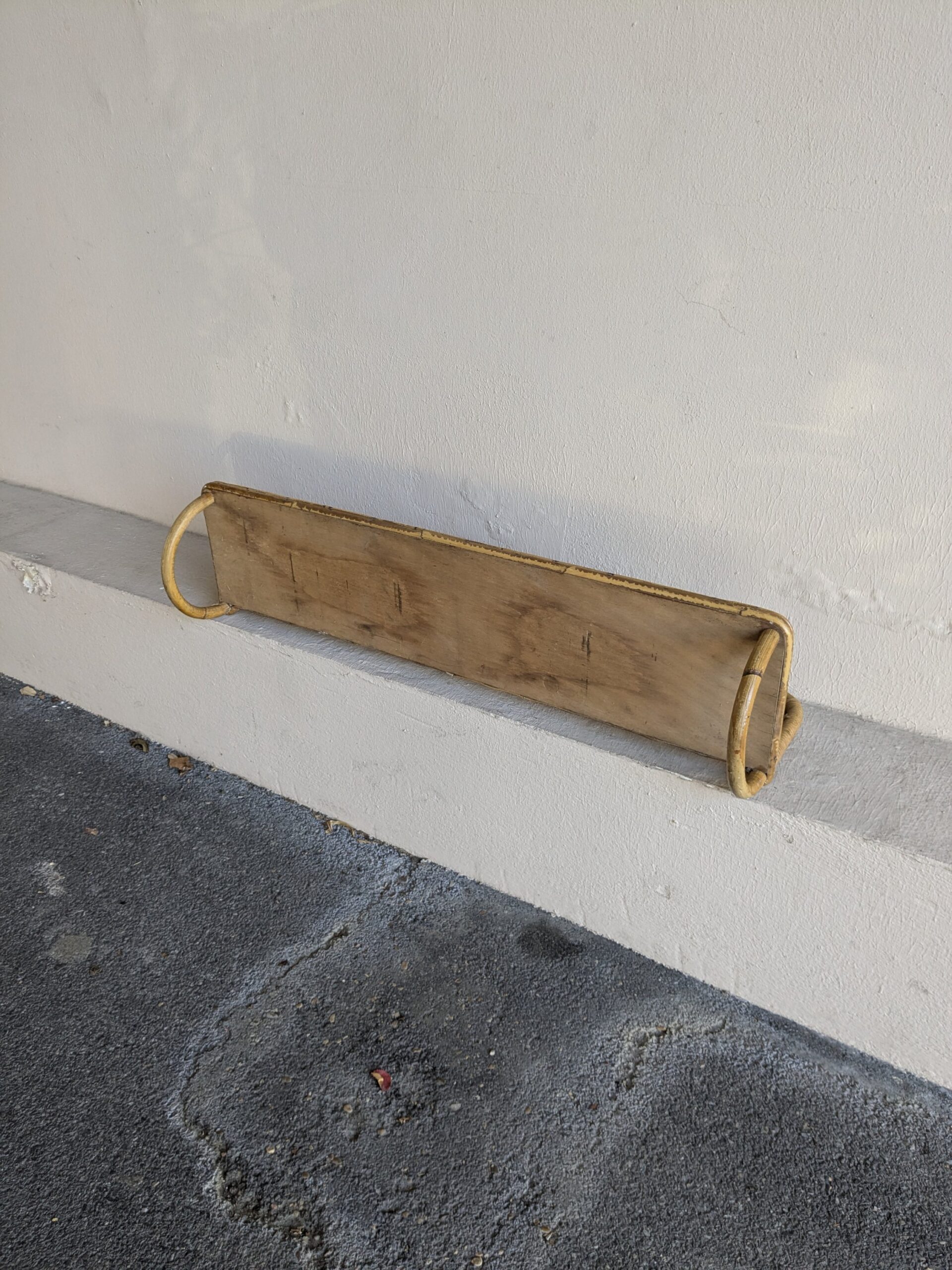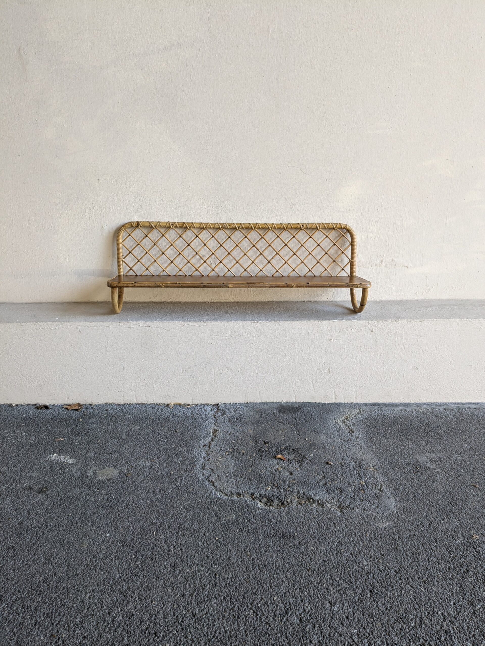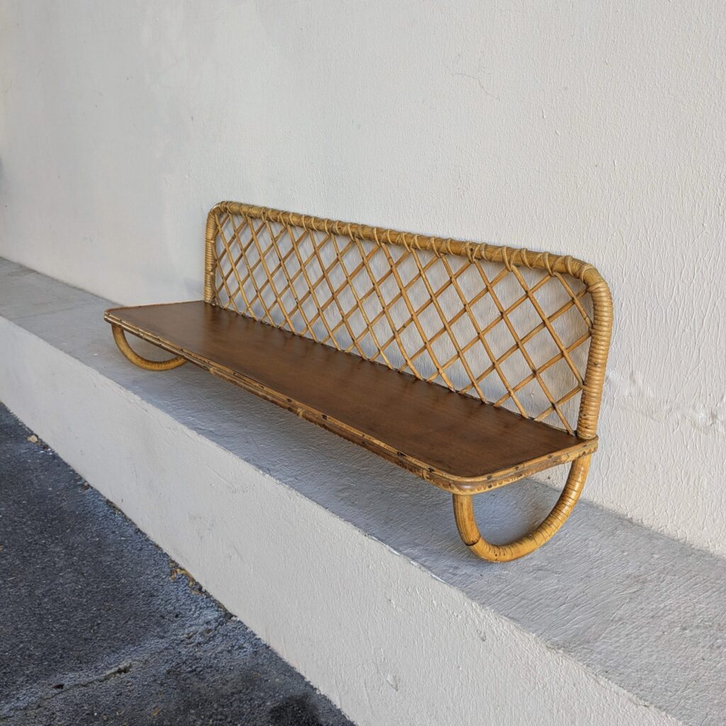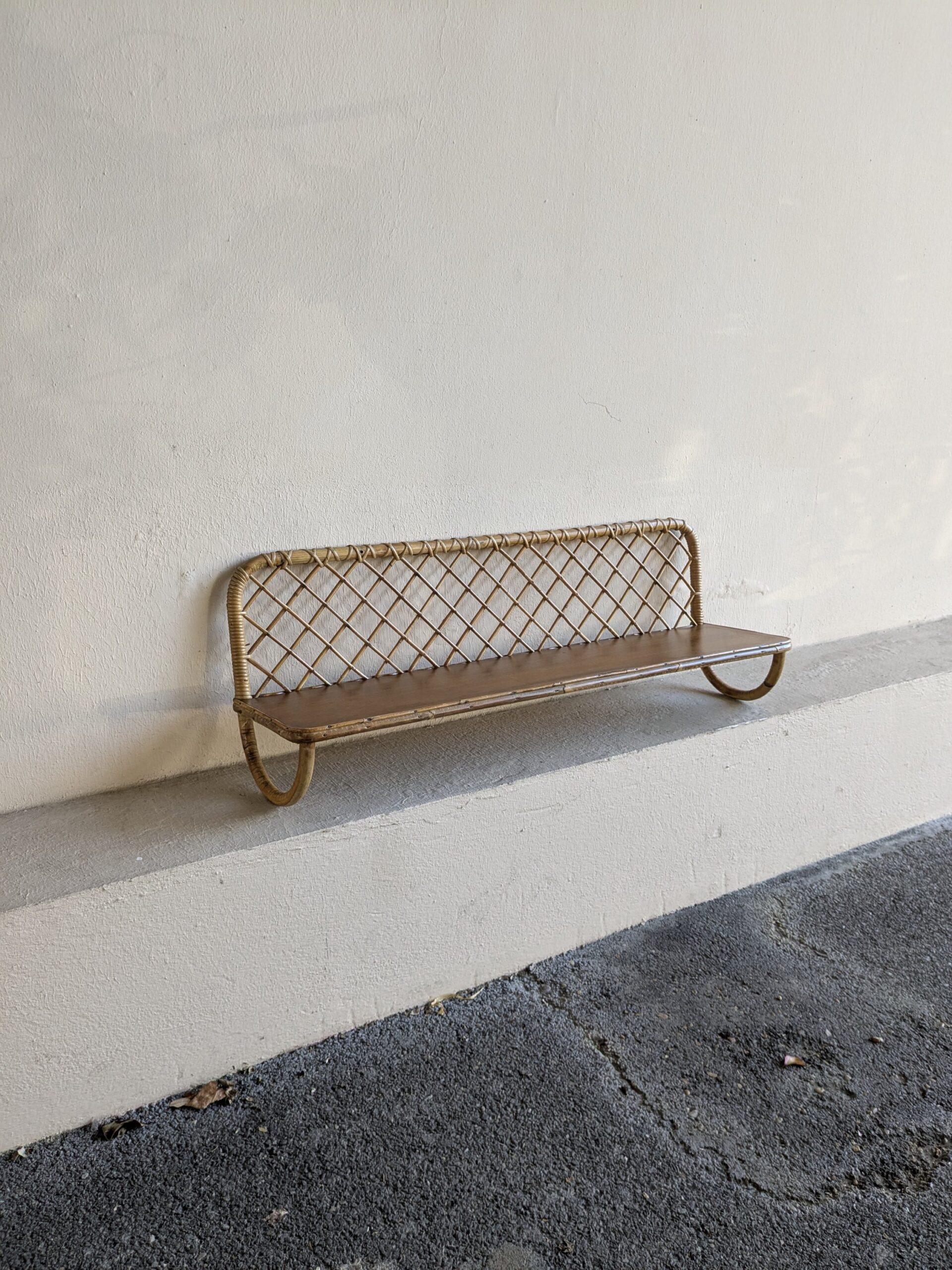 Étagère murale en rotin, le plateau est plaqué en chêne. L’ensemble est en très bon état. Elle sera à fixer avec 2 vis (non fournies).