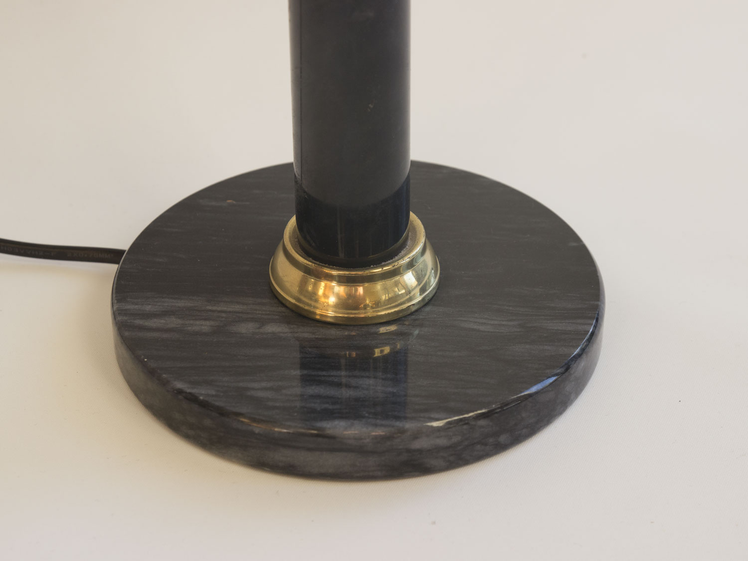 Très belle lampe de banquier en parfait état. L’abat jour inclinable est en métal laqué noir, la base en pierre veinée s’accorde parfaitement avec les détails en laiton doré. L’électricité a été testée et est en parfait état. Petite chaînette en laiton pour l’allumer.