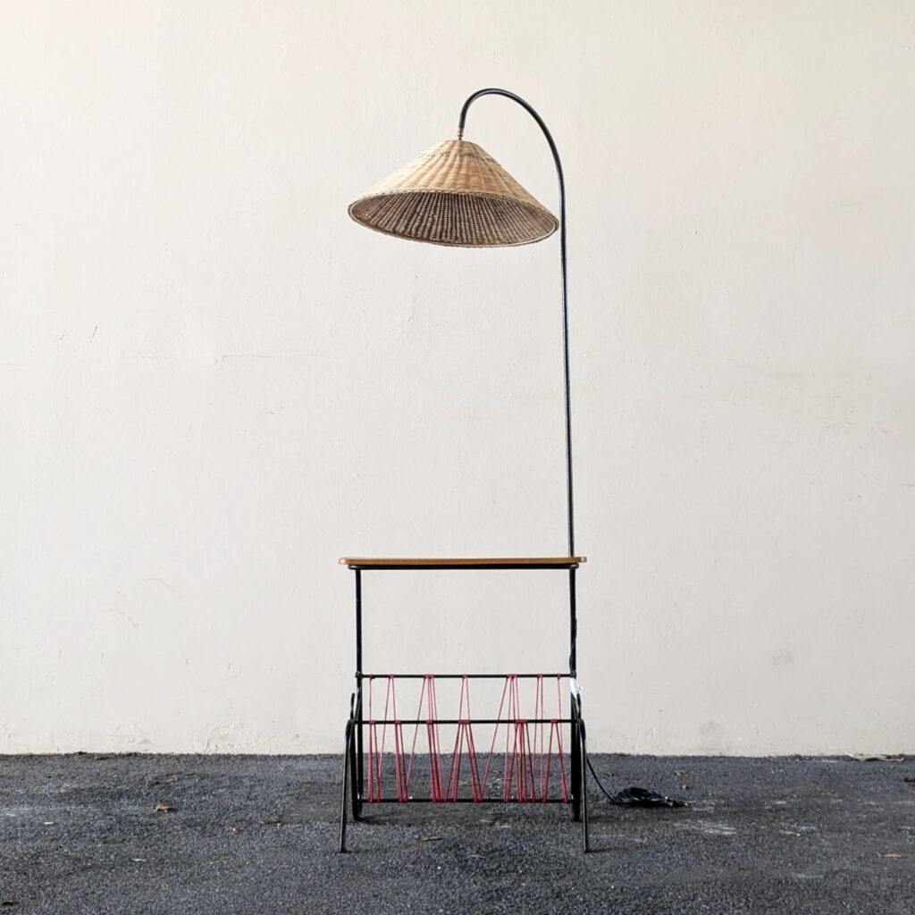 Liseuse vintage composée d’une tablette plaquée chêne et d’un porte-revues en scoubidou rouge. Peut aussi être vendu sans l’abat jour en rotin qui n’est pas d’origine.