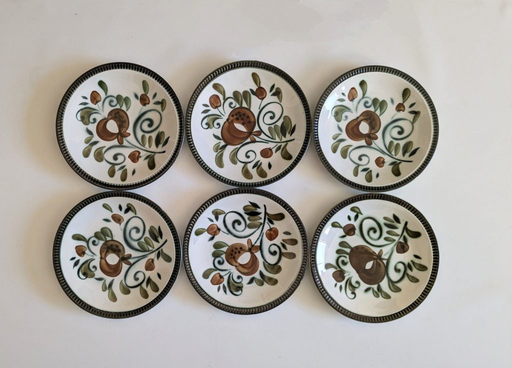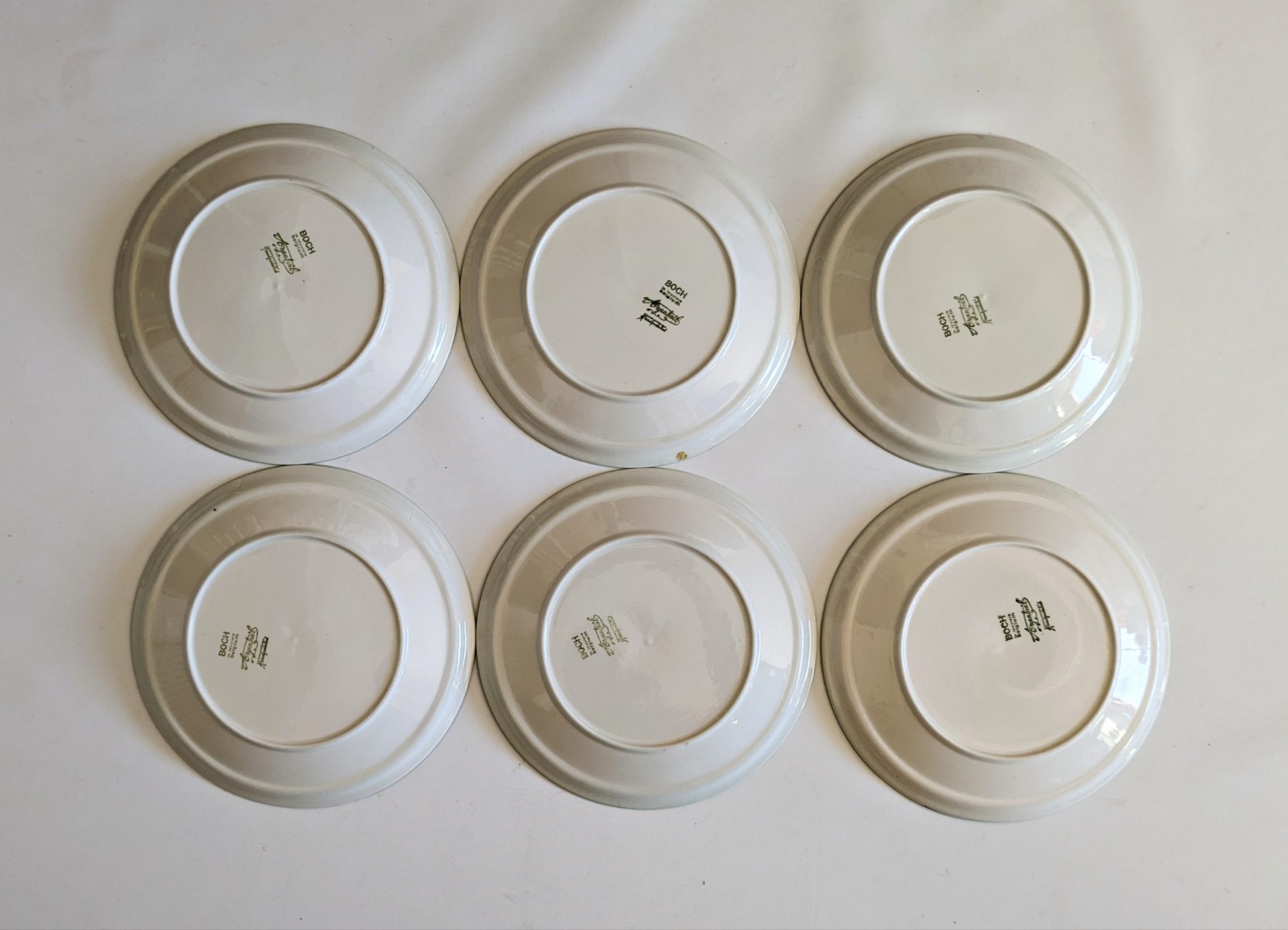 Lot de 6 assiettes plates Boch La Louvière modèle Argenteuil. Production belge des années 60. Joli motif floral vintage dans les tons verts/marrons.