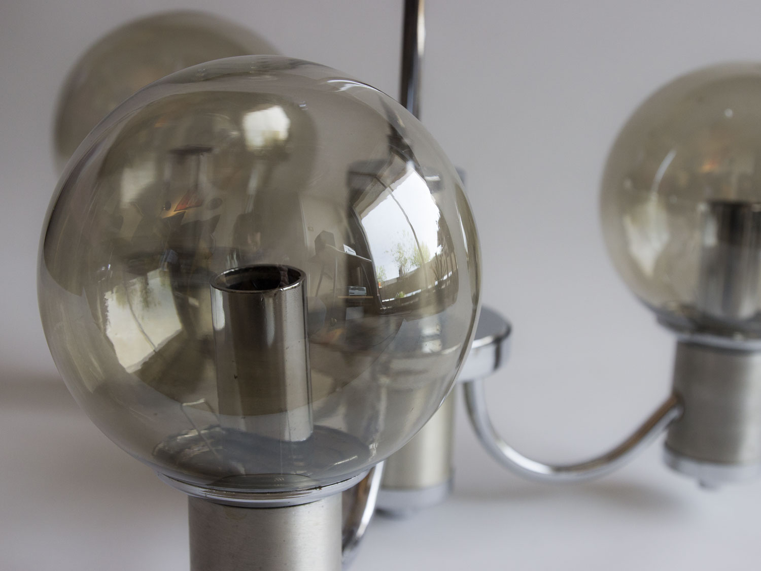 Beau lustre à trois feux en métal chromé et aluminium brossé. Les globes sont en verre fumé, typiques des productions des années 70.