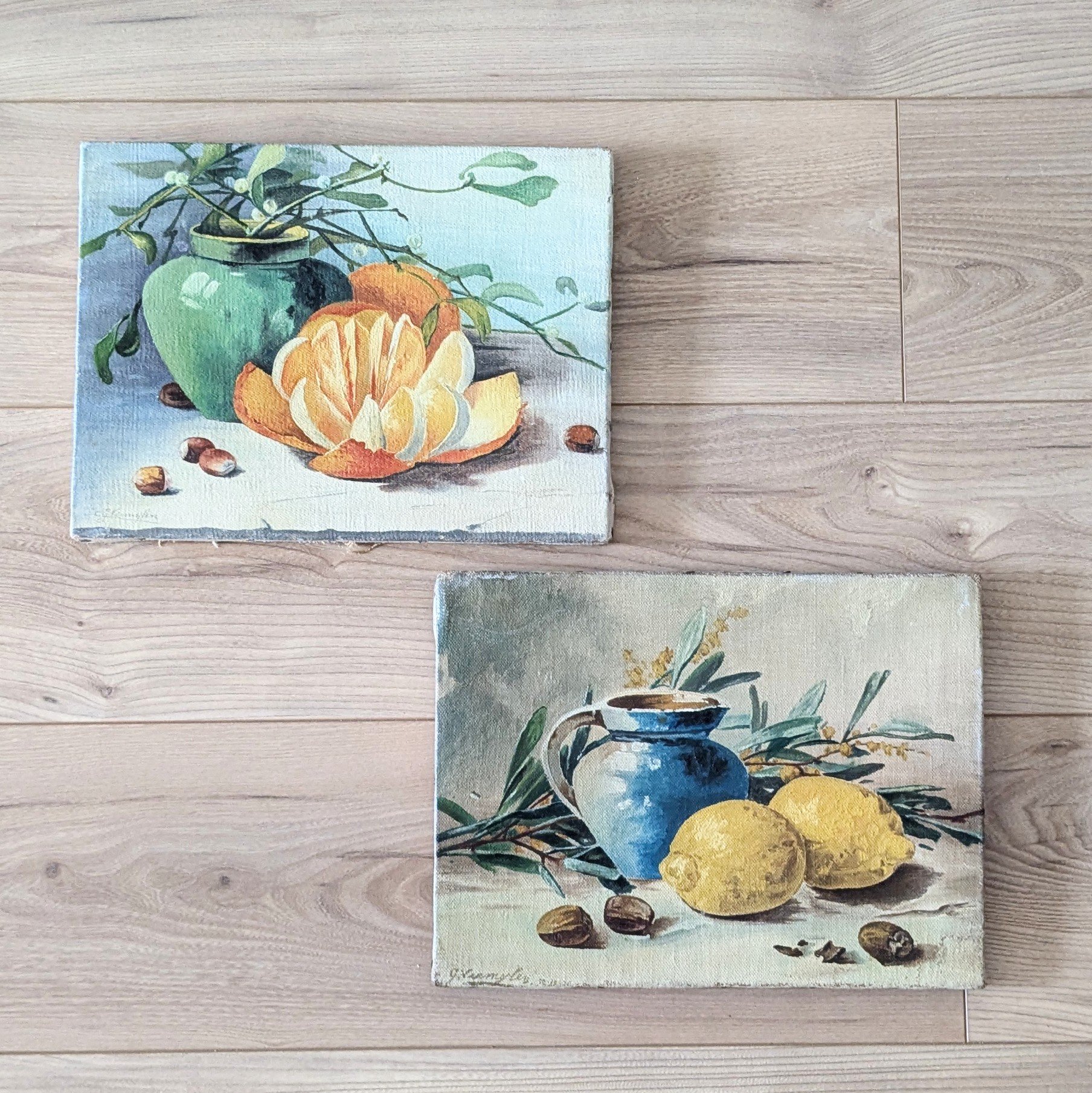 Paire peintures à l’huile représentant des natures mortes aux agrumes. Travail amateur de la première moitié du XXe siècle, signé G. Vermylen 30-12-25. Possibilité de les vendre à l’unité 60 euros pièce.