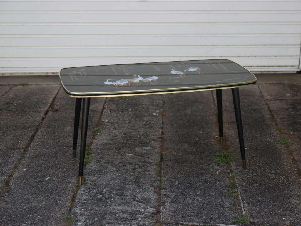 Table basse vintage des années 50. Le plateau est en verre décoré de grues, il est en parfait état, à noter un petit choc sur le champ (voir photo). Table légère pouvant facilement être déplacée et démontée (les pieds se vissent).