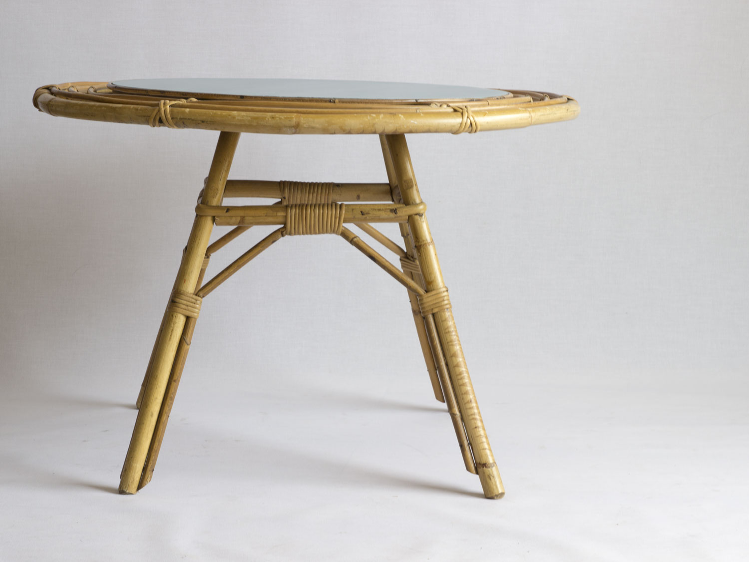 Jolie table basse en rotin des années 60, au plateau rond repeint en bleu (bleu pastel tirant vers le gris). Elle saura se démarquer grâce aux détails de son plateau. Elle est en bon état, mais a été laissée dans son jus (quelques traces d’usures sur le piètement et des éclats de placage au dessous du plateau). Pratique, elle est légère et prend peu de place, elle peut s’adapter aux petits espaces.